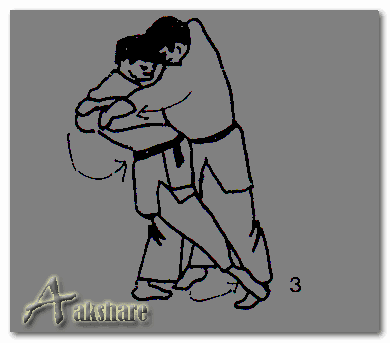 4. Untuk menjaga keseimbangann badannya Uke akan melangkah meju dengan kaki kanannya, sebelum Uke malangkah maju, telapak kaki kiri Tori di letakkan di atsa persendian mata kaki kanan Uke. (Lihat gambar 4, 5 dan 6) pada ketika bersamaan Tori memutar tubuh kekiri dan Tsurite dengan tangan kanan. Uke akan terlempar berputar dan jatuh pada samping kirinya.